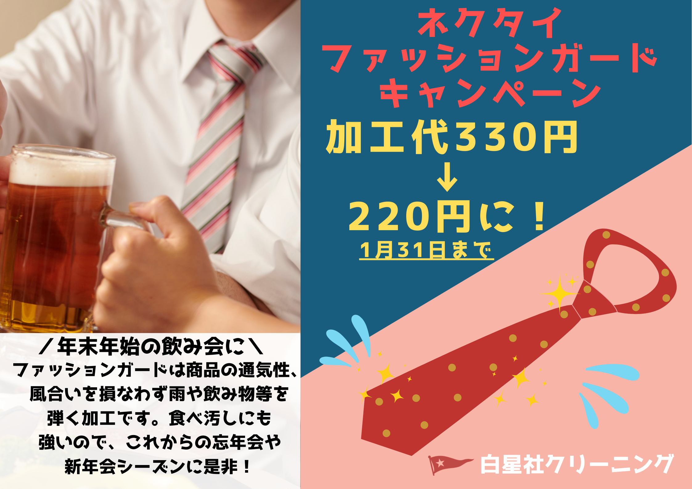お知らせ 年末年始のクリーニングおすすめ情報! 2025.12.05 年末年始シーズンのおすすめ情報 「年末年始シーズン、ネクタイのファッションガードがおすすめです!」 ファッションガードは商品の通気性、風合いを損なわず雨や飲み物等を弾く加工です。食べ汚しにも強いので、これからの忘年会や新年会シーズンに是非! 1月31日までキャンペーン価格に! ネクタイ限定でファッションガードの価格が330円→220円に! 期間は2026年1月31日まで! 割引対象店舗は下記の店舗になります。 ※記載の無い店舗では割引は行っておりません。予めご了承ください。 【割引対象店舗】 ・本社営業所 ・三宮支店 ・名谷支店 ・ポートアイランド支店 ・セリオ店 ・御影支店 ・苦楽園支店 ・阪急六甲店 ・西岡本支店 ・水道筋支店 ・甲南支店 ・摩耶駅前支店 ・住吉支店 ・BRIDGE新町店 秋のクリーニングセールを11月22日からスタート!