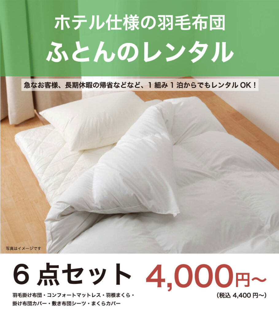 ホテル仕様の羽毛布団レンタルは、急なお客様、長期休暇の帰省などなど、1組み1泊からでもレンタルOK!寝具製造企業とクリーニングのプロがおススメする、清潔で寝心地を追求したレンタルふとんセットです。